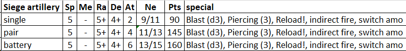 New rule: switch amo. Before firing; the owner of the siege artillery may elect to fire explosive shell (or gravel) instead of solid shell (a single boulder). If your do, the gun multiplies its attacks by 3 at the cost of losing the Blast! special rule and reducing it’s piercing value to (1) for that attack. A battery needs to select the same shot for all its guns.
