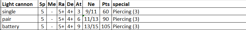 Light cannons can be upgraded to horse artillery (or chariot drawn balista or similar unit) for +10 points (single), +15 (pair) or +20 (battery) . If you do, they increase their speed to 8 and gain nimble at the costs of increasing their base size to 50*100 (single) 100*100 (pair) or 150*100mm (battery)