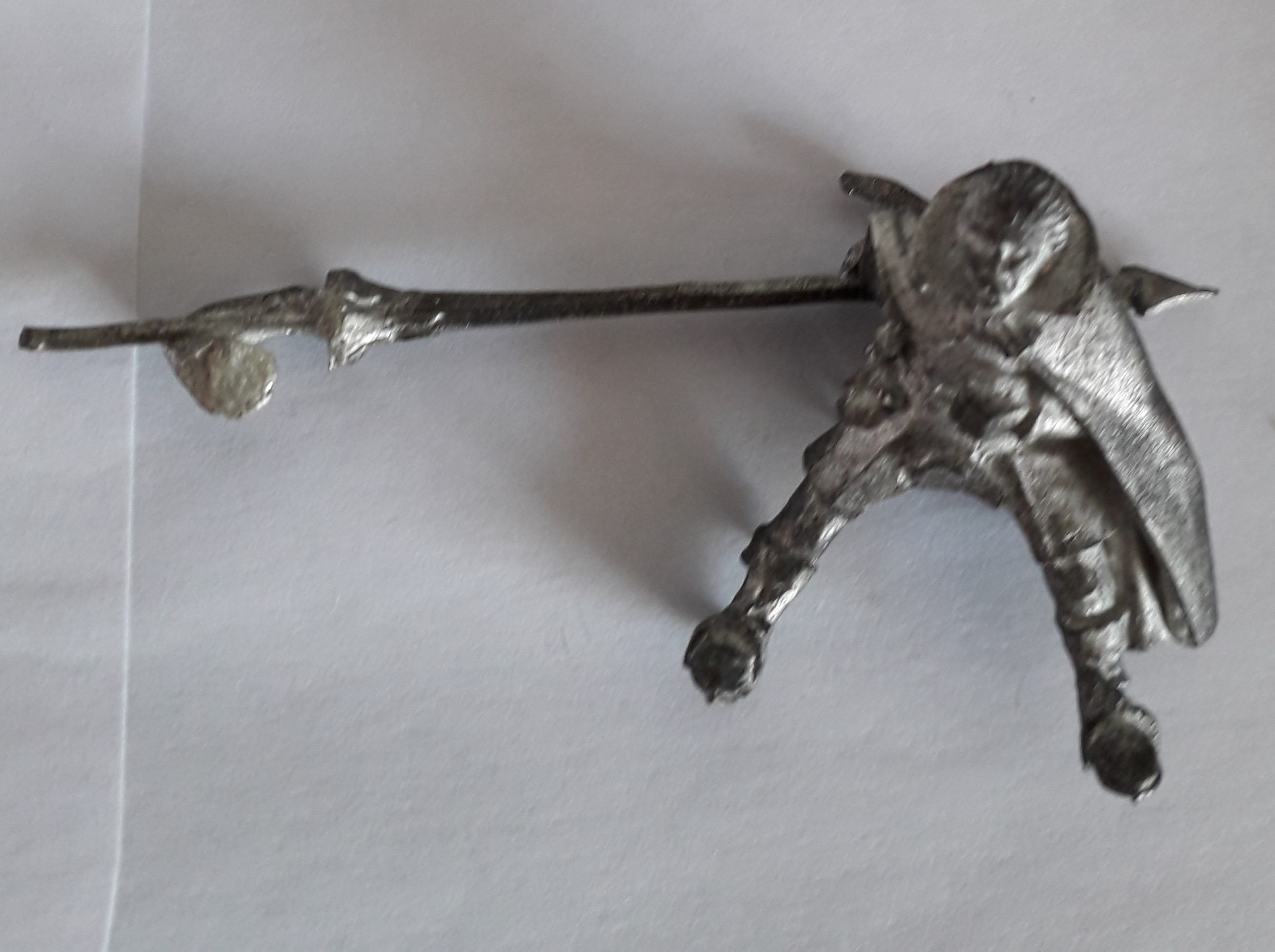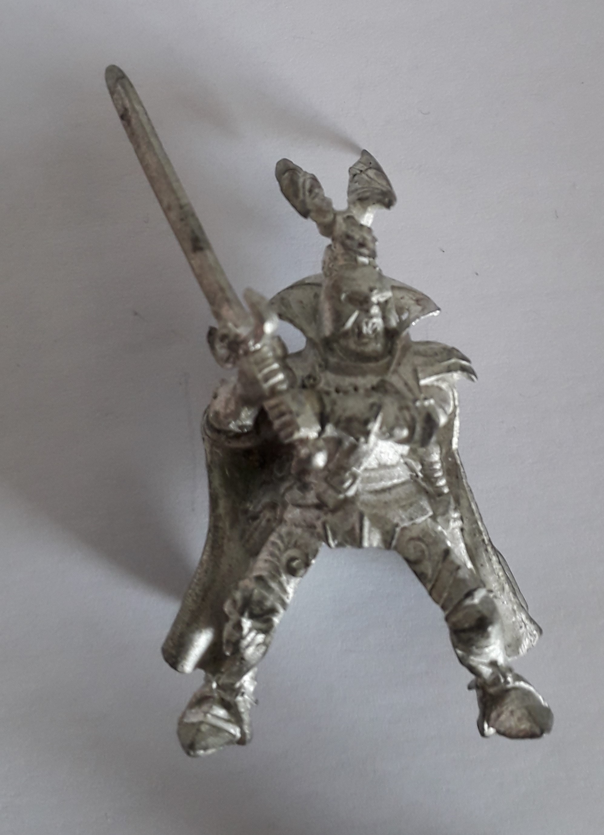 He’s in a sorry state. After cleaning him, I tried a thinned down ink wash to show the details (it didn’t hold) and I painted the head black to see if the paint would hold. (it did) Other than that, he’s in the same state as when I bought him.