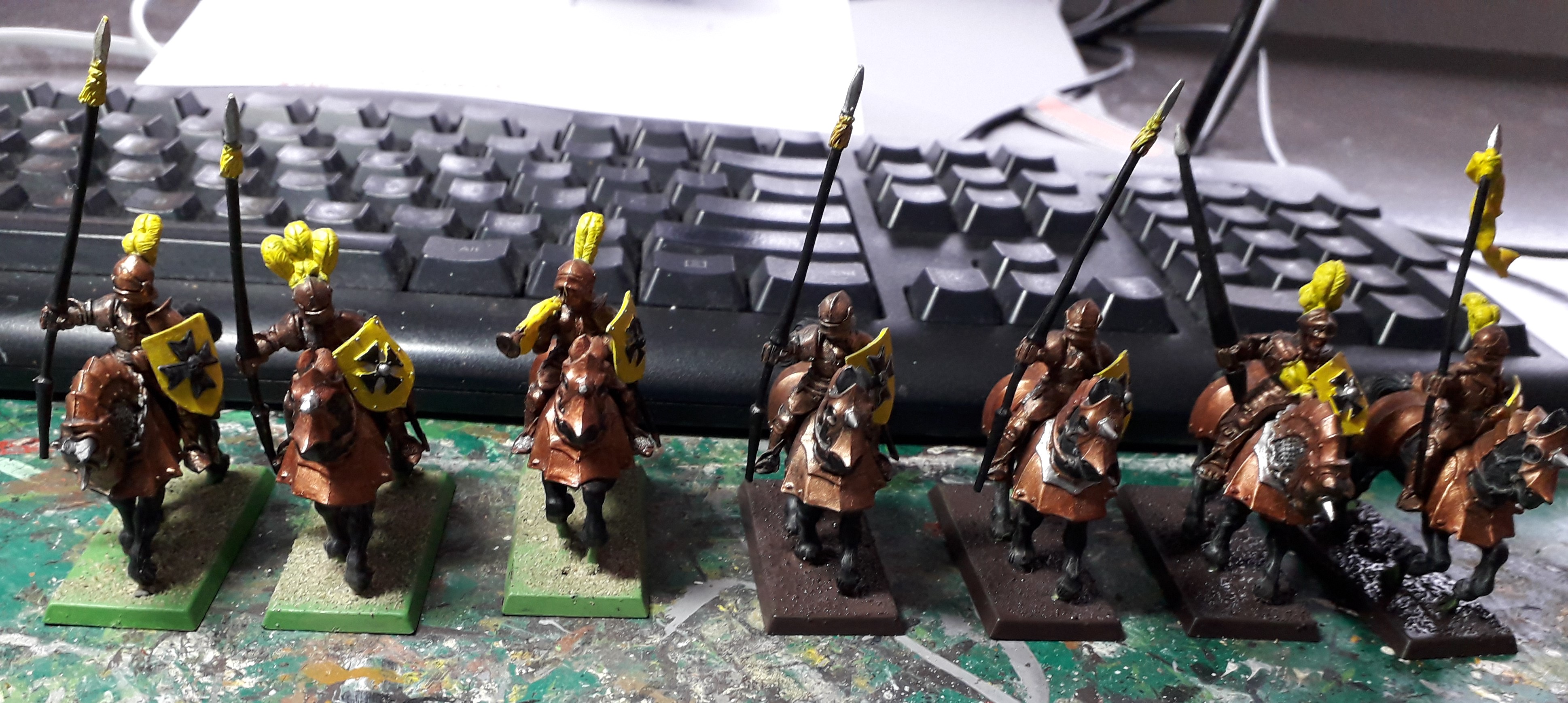 The above picture is mid-process. I’ve sanded the green bases after which I’ve painted them black-brown basecoat. As soon this layer is dry, I’m gonna paint the green grass so it -at least- matches the rest of my knights.