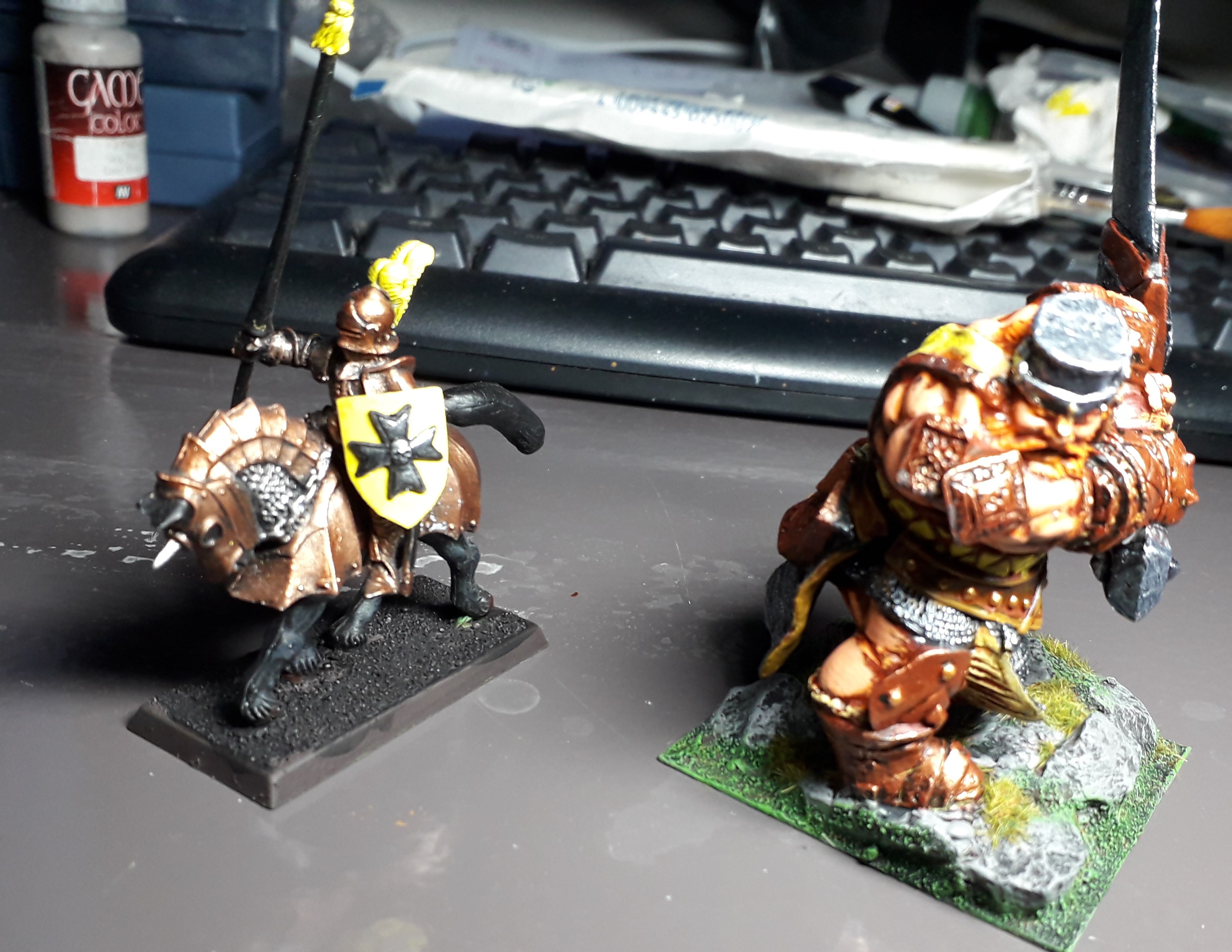 The final result, however, isn;t that bad. The low details make for easy painting and the striking colour scheme help a lot. Here’s a picture of him plus a knight for size.
