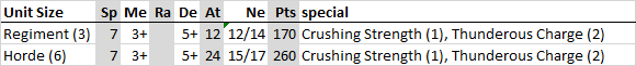 That said, if either their attacks increased to 8 or 9 and/or they would gain TC 1, I’d love to try them as harrassing cavalry. As of now, that role is much better suited to chariots.
