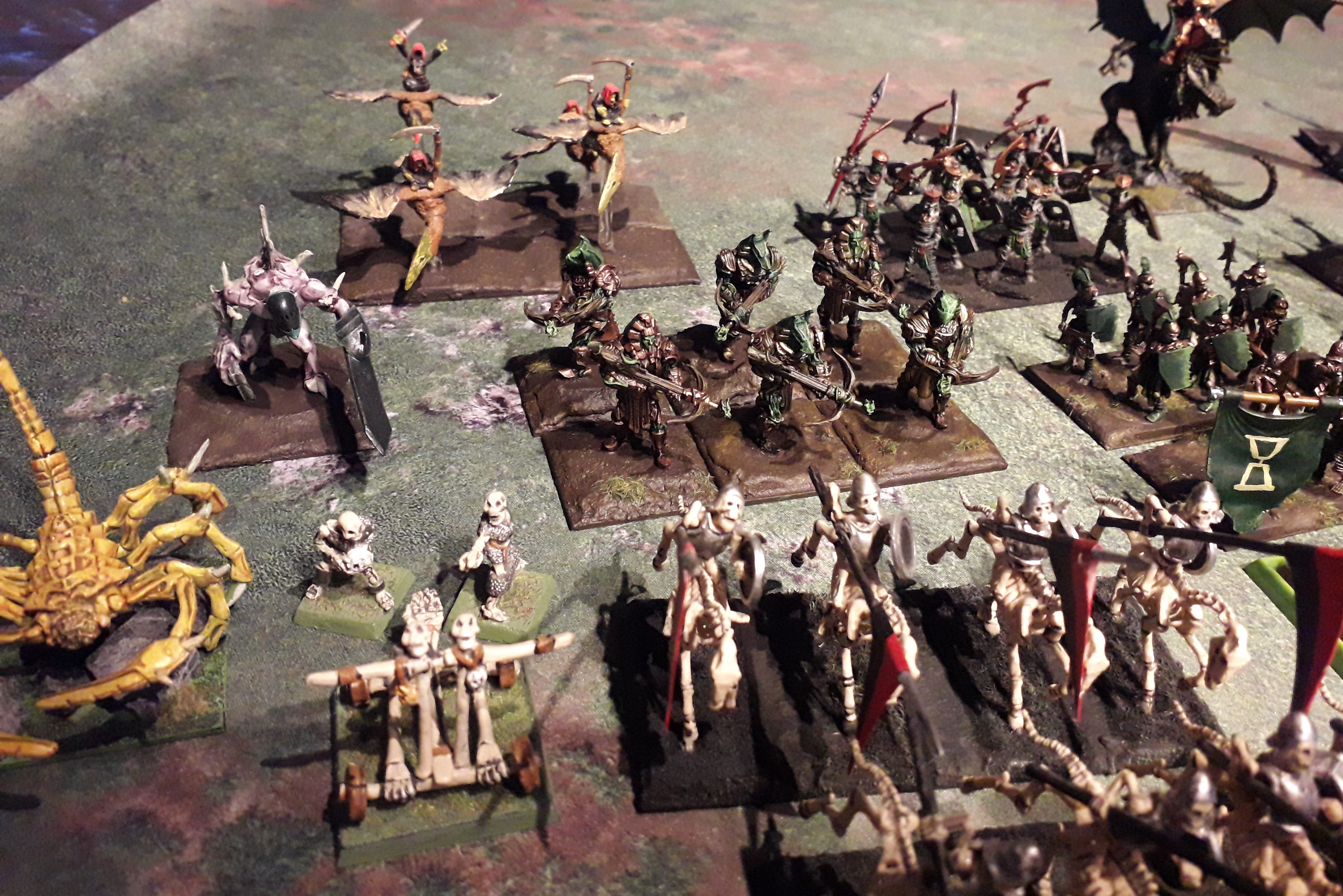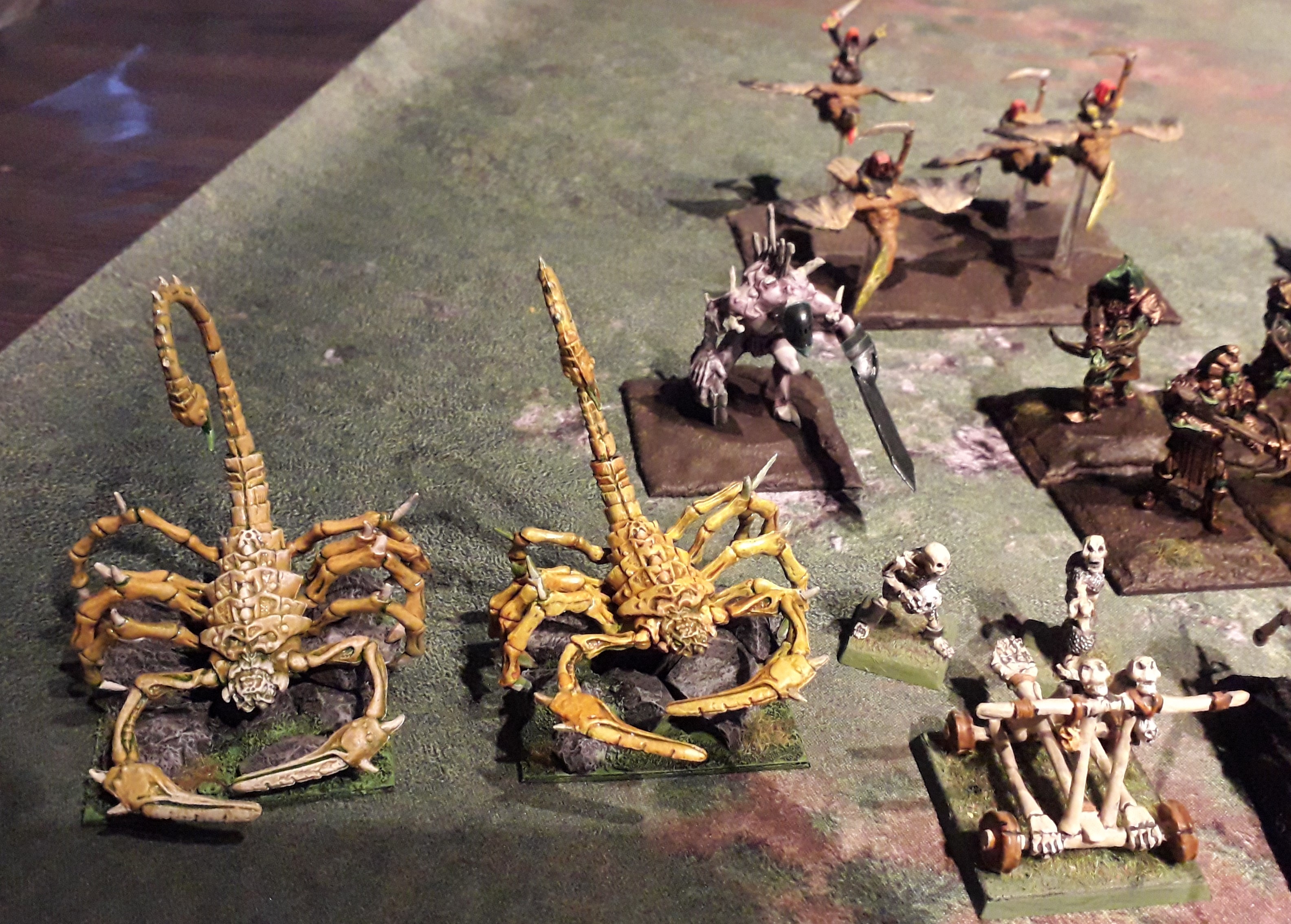 The army is a combination of empire of dust (leftmost side) and undead and of course some units that both share. There’s also some units that I share between armies. The scorpions, for instance, also appear as forsaken beasts in my Brotherhood army, while the ghouls also feature as lower abyssals in my Swamp things army.