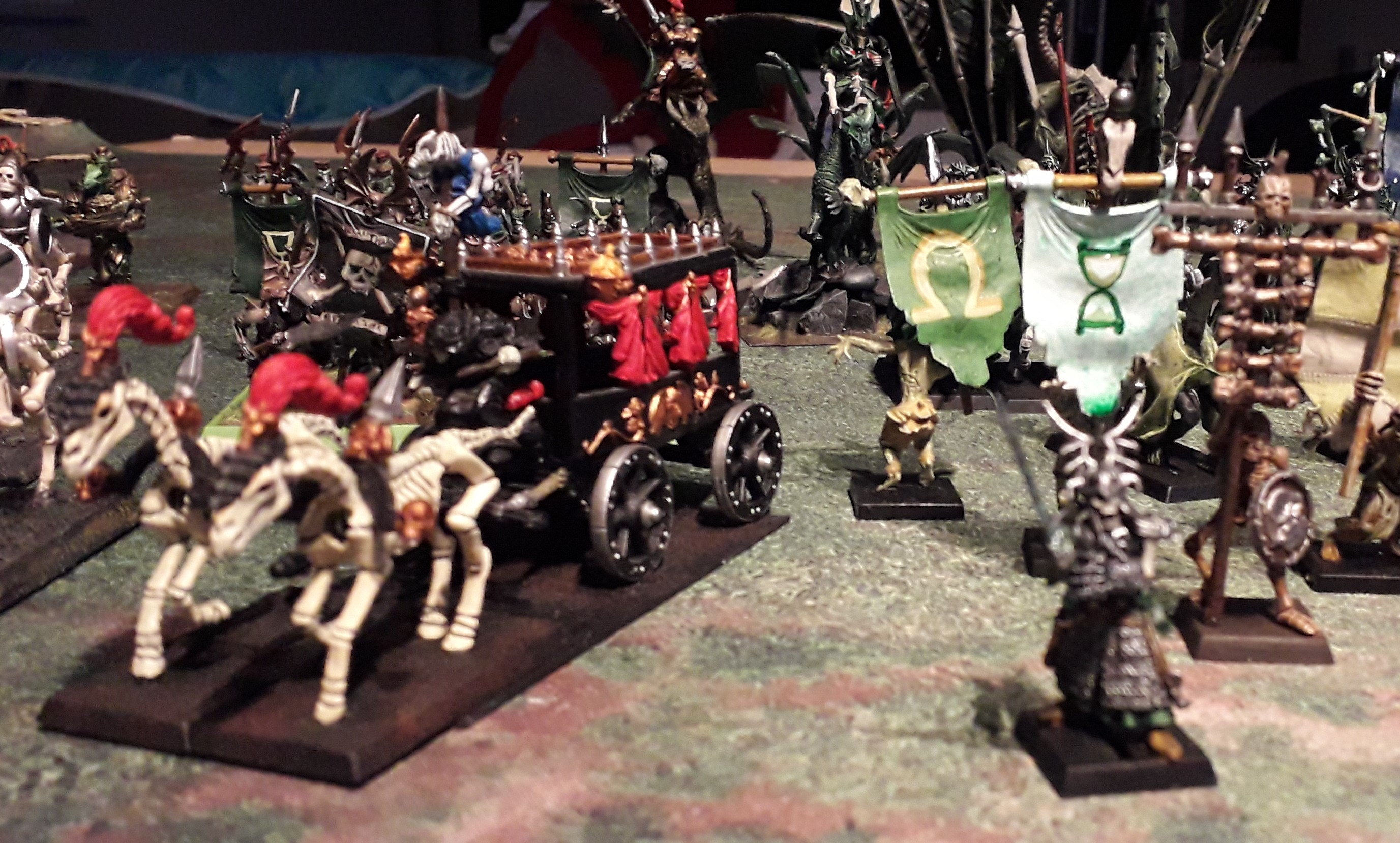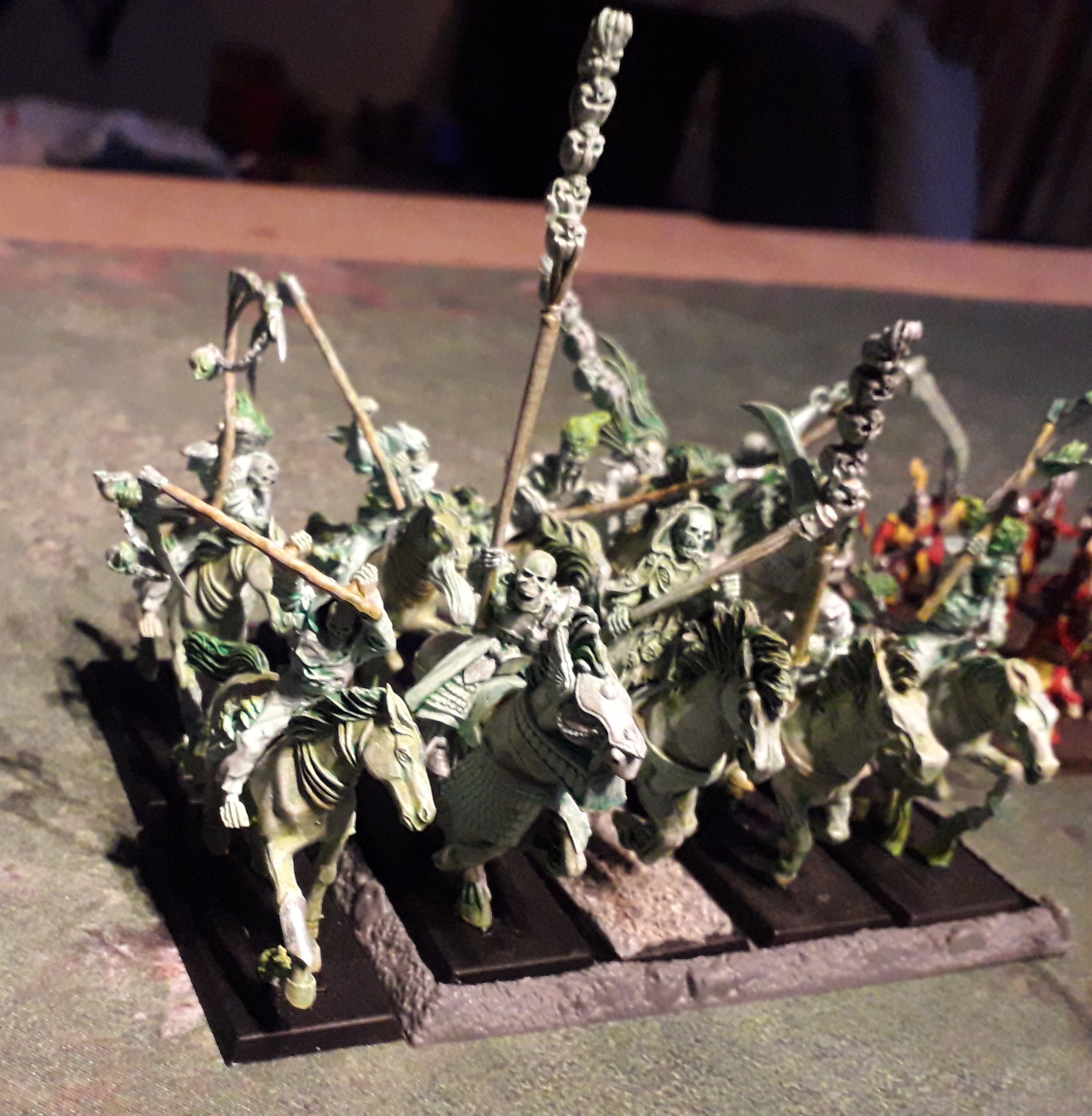 This picture starts at the left side (empire of dust’s side), there’s the revenant chariot regiment and 3 troops of skeleton horsemen. These were part of an online auction, which is the main reason the colours (black/red) differ from the rest of the army. I might paint these over one time.
