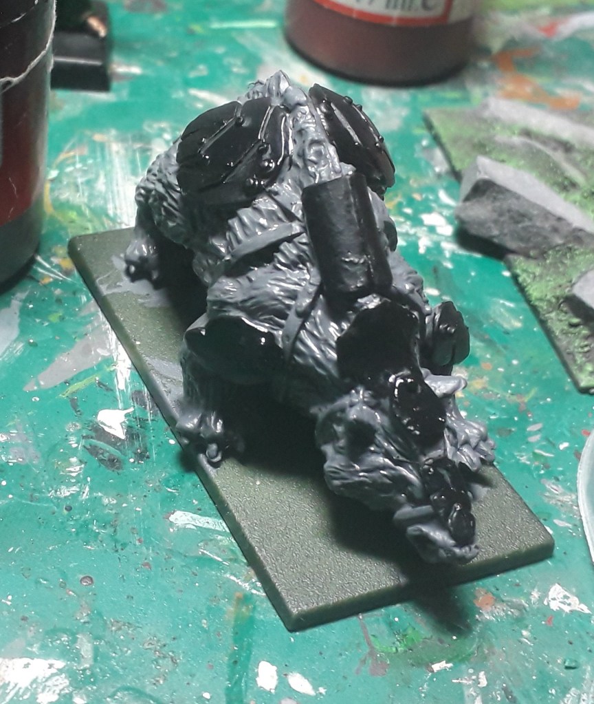 First I built the brock and spraypainted him black. Bear in mind that the spraypaint’s function is that paint now sticks to the model. It doesn’t have to be opaque, for if it does, it might blot out the detail of the model a bit.