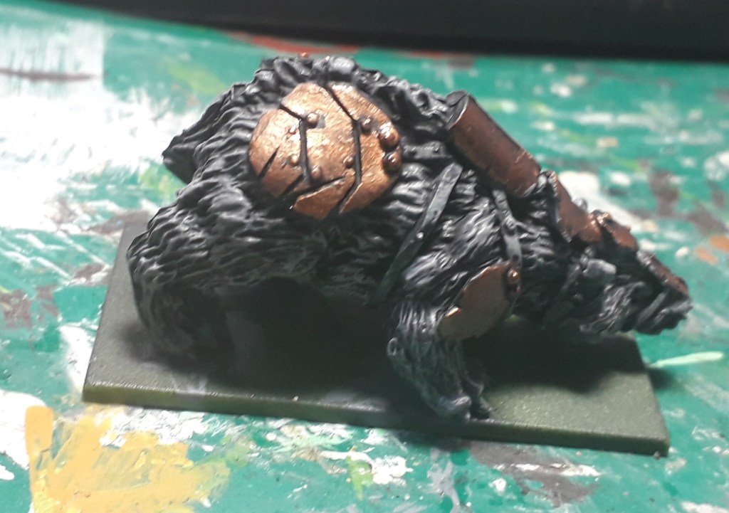 As soon as the model is dry again (and it needs to be 100% dry this time) you can ink it. I used a thinned down (50% ink/50% water) black ink wash for the entire model, both fur and armour.
