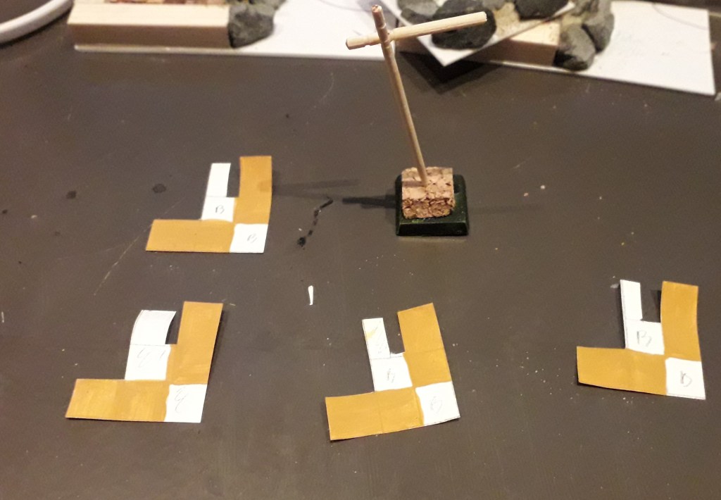 The banners itself were made from white printing paper, painted in a quartered pattern. As seen above and on the right, the banners are cut from a 30mm square and they end up 18mm.