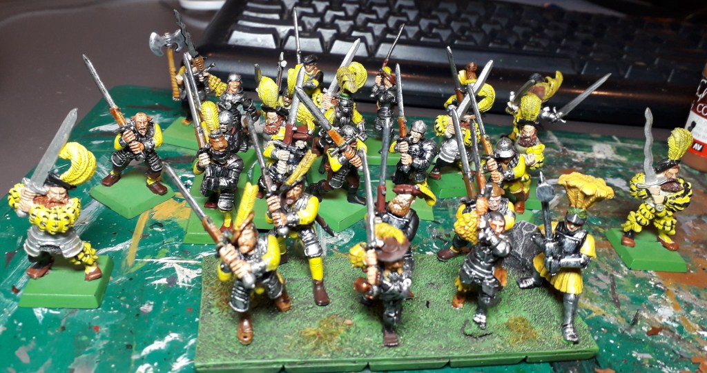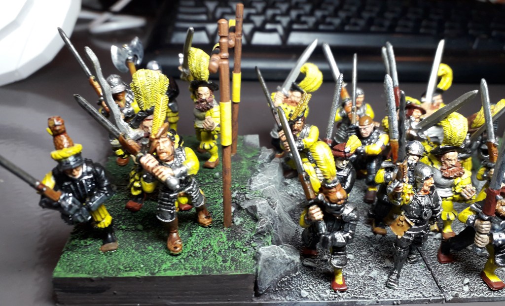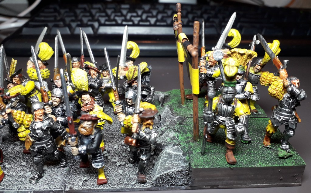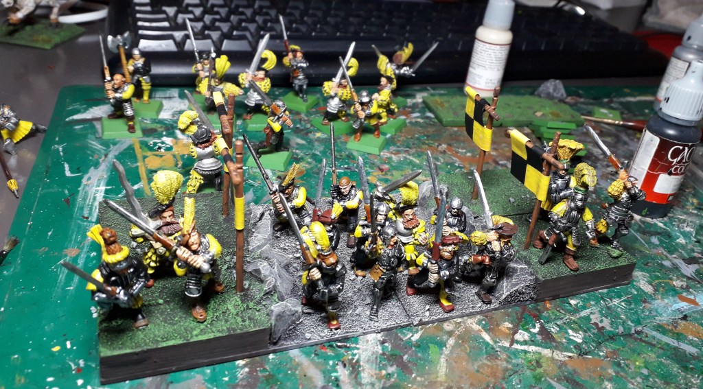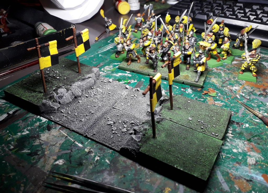 As usual, the multibase is a bit of a diorama. It depicts a road in the landscape, traveled by the unit. The road is lined with banners, to show that it’s part of the Topaz lands with the black-and-yellow quartered banner.