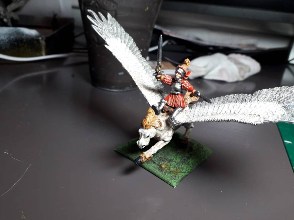 I’ve also finished another (small) project. As I own a captain on a pegasus (leftmost picture), I also want a pegasus for my other human army. (for mirror matches). The two pegasusses (Pegasi?) I own are one-of-a kind pegasi that I want to spend some effort painting, so they go into my main army.