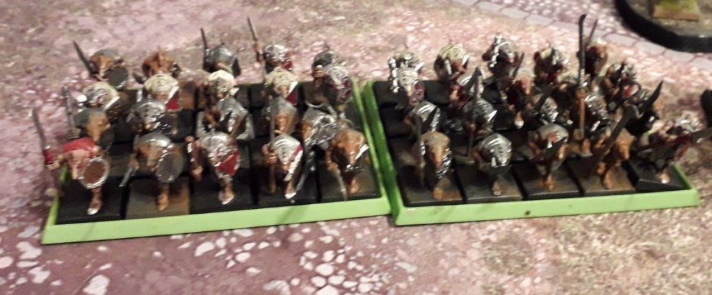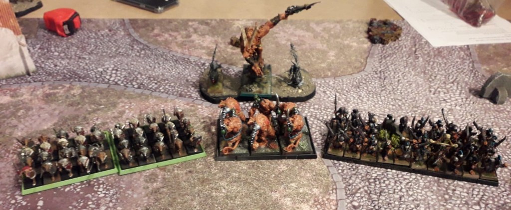 Then, a flank charge of a unit knights into a unit of already damaged shock troops (32 attacks@ 3’s and then 2’s) resulted in only 7 wounds (and therefore a “steady”) . The following turn’s charge (after the knights were destroyed by a double charge from the mutant fiend and nightmares) with my pikemen resulted in the dreaded double one.
