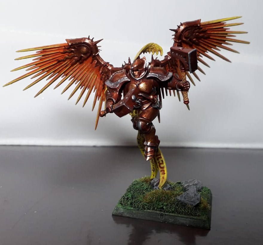 The Visitor was unlike many he’d seen before. The man was tall, towering a full head over courtiers and guardsmen alike. His brass armour did not hide his enormous bulk as much as it accentuated it, and he was surrounded by a certain aura of confidence as he strode onwards into the reception hall. Increasing his already considerable bulk were two giantic wings, now folded on his back. All-in, the visitor was impressive, awing the courtiers of the archdukal palace around him.