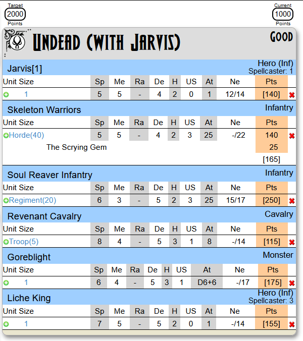 Downgrading the legion of zombies to a horde would free up 55 points, leaving 50 points to spend in the case above. Since I could not upgrade the soul reavers due to the 250 point limit, the only option is to load up the lich king with spells. Normally a valid uption, but I wanted to select spells from the various planes instead, so I wanted him without upgrades. An alternative forray combining a horde of zombies and a mounted vampire lord instead of the lich added up to 1,010 points, leaving me slightly frustrated.