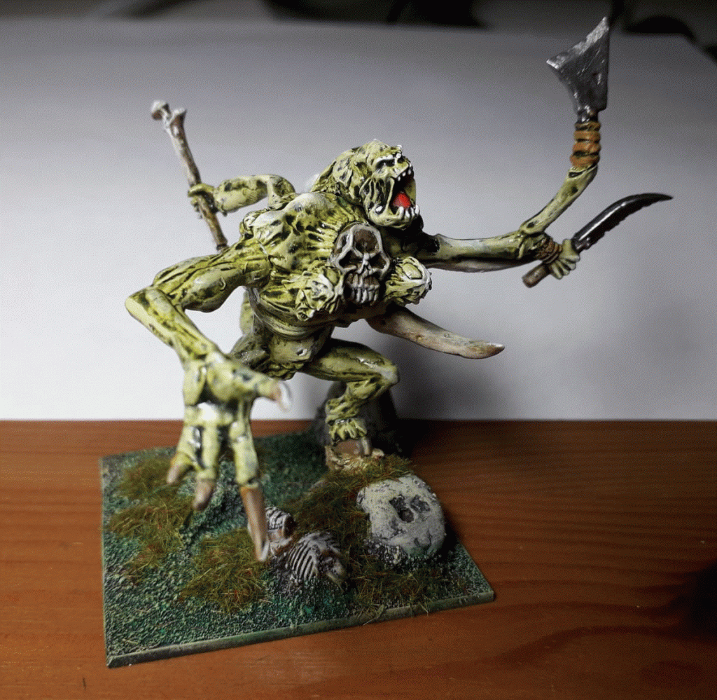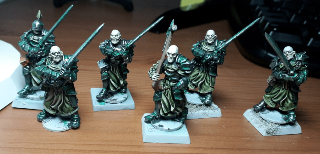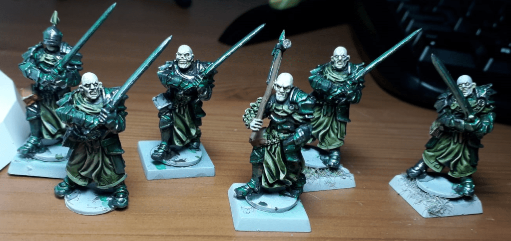I still love the combination of ghoul heads with paladin foot guard bodies. As for this batch, I’ve experimented with other bits from my bits box such as the hammer from an old 2000-ish Warhammer Empire state troop champion and the sergeants’ helm from a perry twins mercenary plastic set. It’s good to have a well-filled bits box!