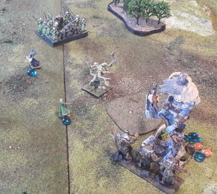 Likewise, the reaction from the Northern Alliance general was conservative. The units defending the centre consolidated their hold, inching slightly backward to get out of the vampires’ immediate threat. On the far right (from my side), the frost trolls moved through the forest to support the giant next turn and the thane advanced enough to be able to support any one unit when it would charge. On the left, the wolves finally saw room to move out as opposing forces moved away. The beast sharply turned right and ran as far as they could, facing the edge of the board.