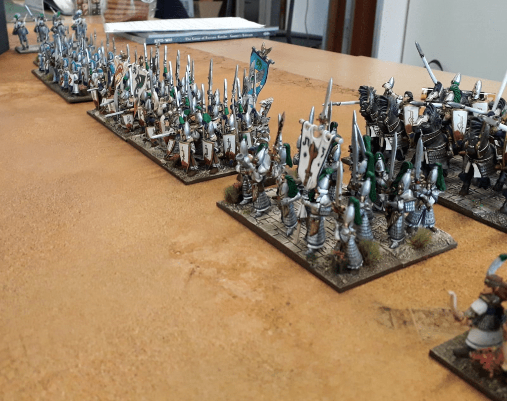 Battle 2 I faced against and elf list consisting of 3 archmages with all the lightning shenigans, 3 regiments of archers, 3 units of palace guard (horde, regiment, troop) a single regiment of stormwind, of silverbreeze, a mounted king and a dragon. His playstyle was very much like mine (counterpunch) but I quickly learned why KoM are a better list for this playstyle.