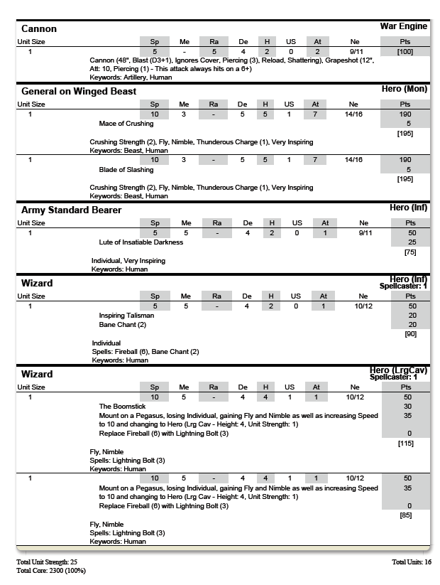 While the generals on winged beast gets underestimated a lot, the wizz on pegasus gets overestimated even more. It’s 85 points for a LB(3) dude on a peg. One has the boomstick for 30 to upgrade the lightning to (6) and I’m not sure if this is worth the points. The amount of hate these dudes get thrown towards them is enormous with people checking charge lanes and flanks even when I reminded them they only have one attack at melee 5+.