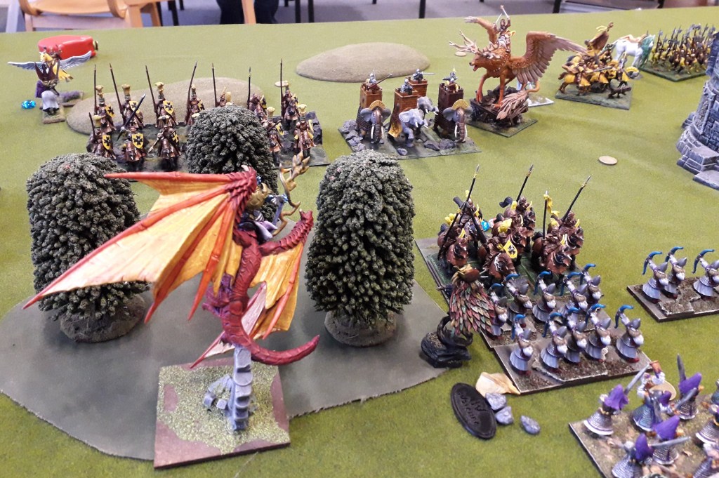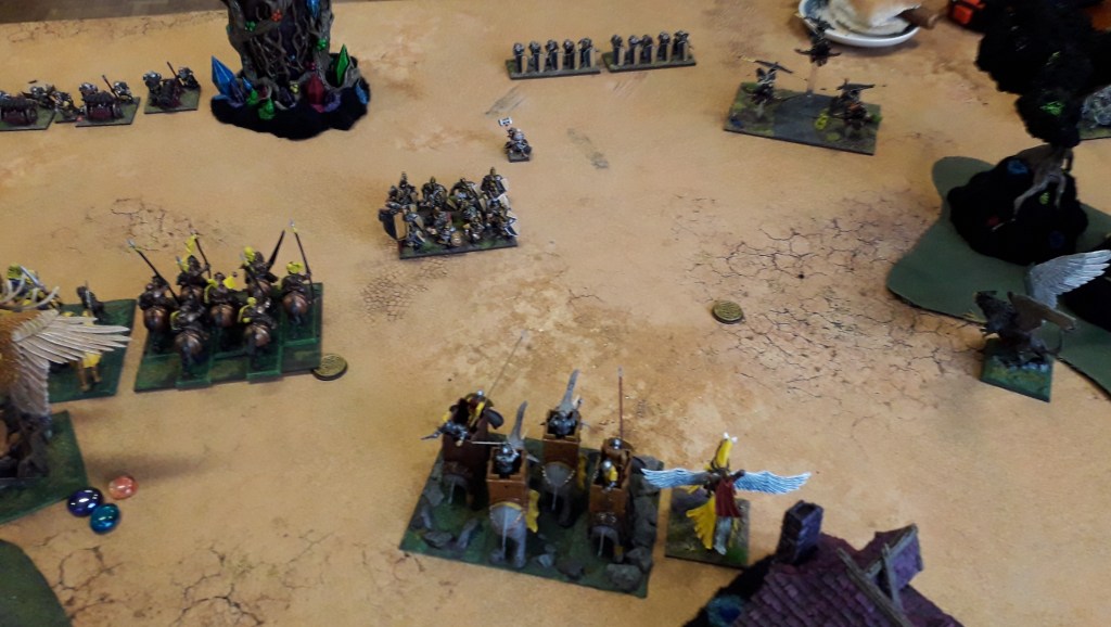 These units proved to be point traps. Both the elephants and the titan didn’t perform as they should be. The lower movement of the beast cavalry (7 over 8) cost me a charge (and possibly the game) and most definately they didn’t warrant the extra point investment. The queen, beautiful as she was, failed utterly. Due to her titan-ic (pun intended) base size, she couldn’t perform the same role as my generals-on-winged-beasts do (hunting flanks) and so she mostly got frontal charges. And 10 attacks in the front do only as much damage as a regiment of knights. For double the points.