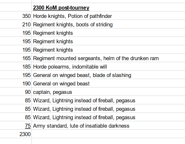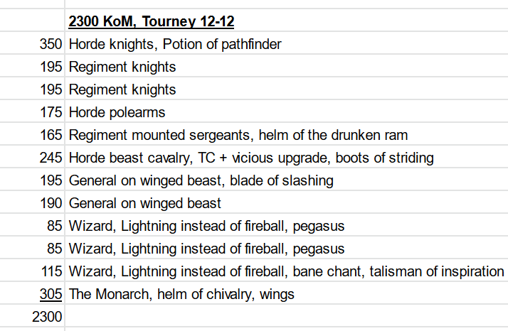So, after the tournament, I went to easyarmy again and axed anything that was too expensive for the battlefield purpose. Mage-on-horse? Just there for bane chant and inpiration, so why not take an ASB with the lute? Pitty about the model, though. Elephants? Demote to knights, etc.
