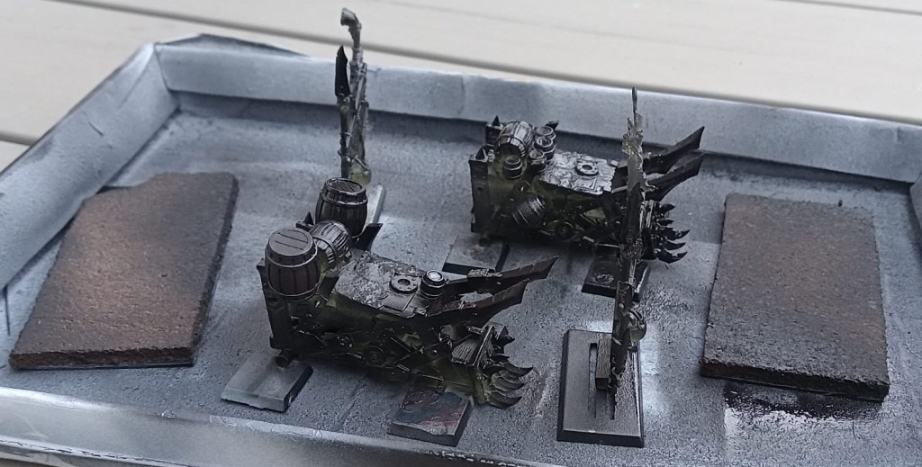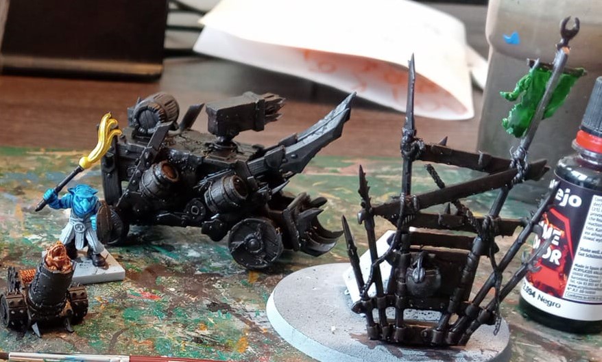 At this time, I built the 2nd and 3rd model. They were henceforth undercoated black. As the original model only has a single barrel (steam engine expansion vat), I supplemented my models with additional barrels. Some came from my brother, other from historical models I didn’t know I had and finally two from my dungeon saga set.