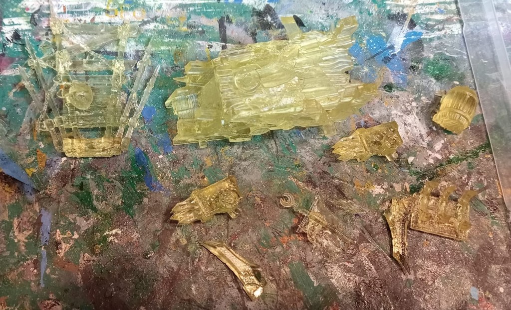 Cutting the supports proved to be…. time consuming. Here’s all the parts for a single blaster, even without the crew. The printed parts needed to be cut free, cleaned from remaining supports, washed with alcohol and then finally cleaned with water again.