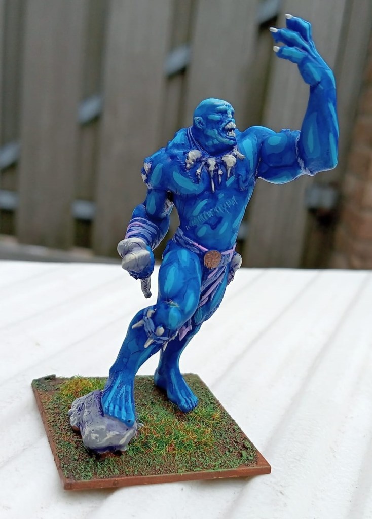 I leaned towards purple, until I saw the green-grass basing of the blue ogre which contrasted much better. Moreover, my ogres match with my goblins and can join them if I want to. There’s even some crossover in the red (no, blue!) goblins in the ogre army list! So in the end, I decided in favour of the blue ogre and so the “Blue-gres” were born.