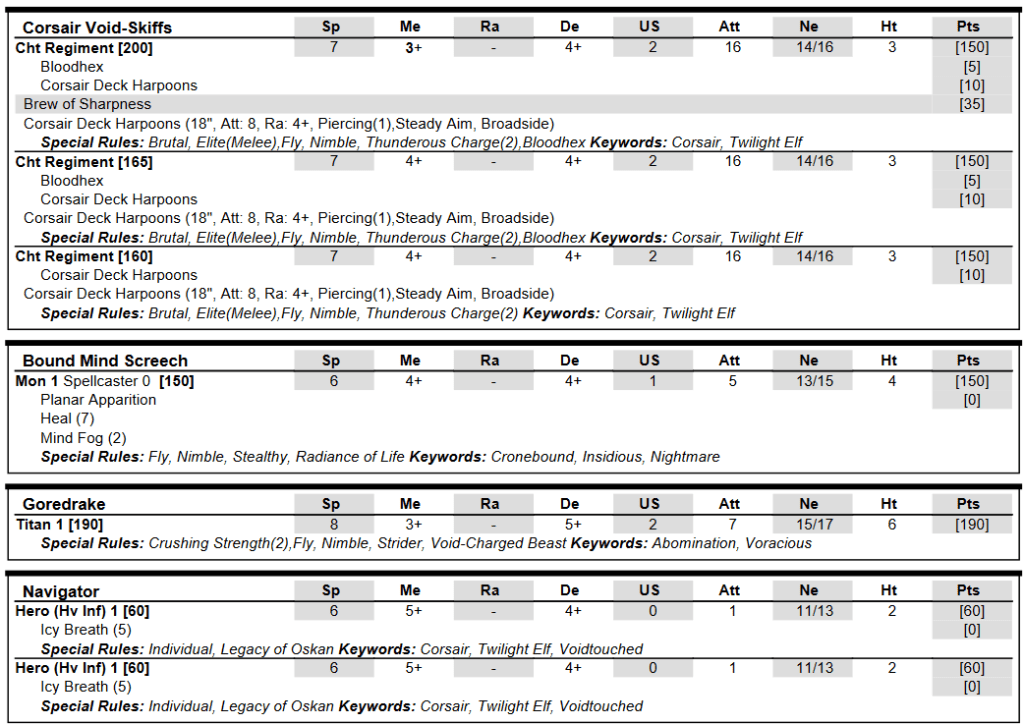 The void skiffs are good and you’ll need them for the unlocks. Again, blood hex is mandatory, harpoons however, aren’t. The navigators, good as they might be, take up a character slot. La’thael grans stealth anyhow, so two is at least one too many and maybe the 2nd is surplus too. As for the crones, you want three, but only with weakness. All the rest is wasted points. As for the goredrake, it’s okay-ish, but there are better options.
