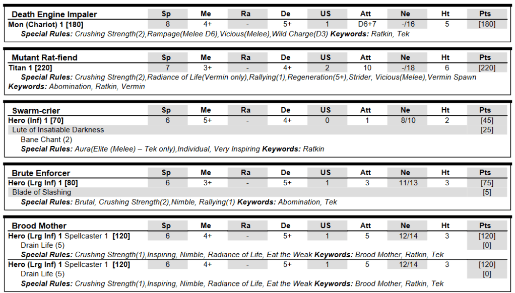 The list, however, has been analysed by my brother and myself and has the possibility to be turned into a killer. T’kin are nasty and my experience this evening convinced me of their viability. The army above needs more hitting power and there’s quite a few units that can be changed to achieve this.