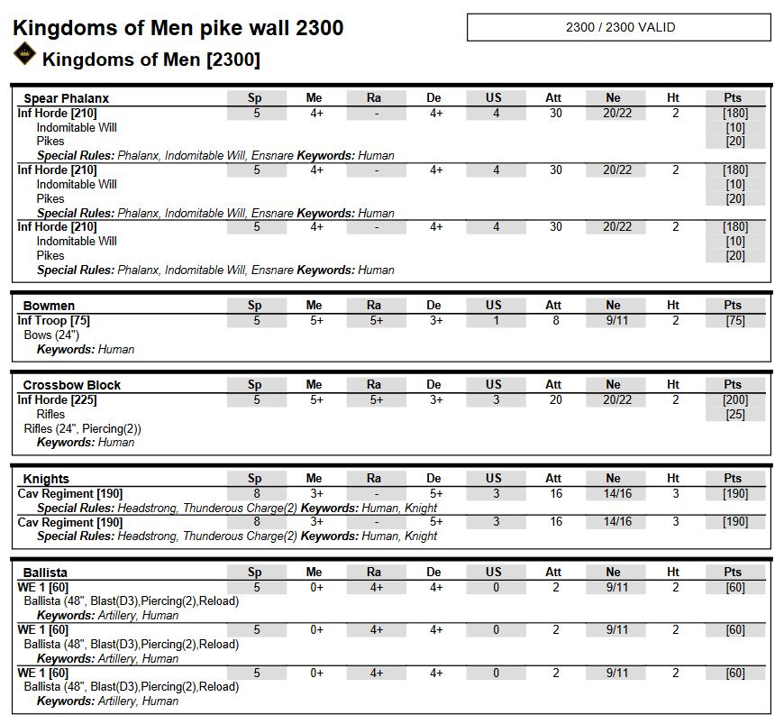 The unit that needs some explanation is the full horde of upgraded crossbowmen. This is a unit that is objectively sub-optimal. The unit is not *good* or point efficient, especially compared to options that other armies have. Their average damage against def 5+ (even when not moving) is 4-and-a-bit which is abysmal, especially considering their 225-point price tag. When moving, facing cover or stealth, the damage becomes nearly non-existent.