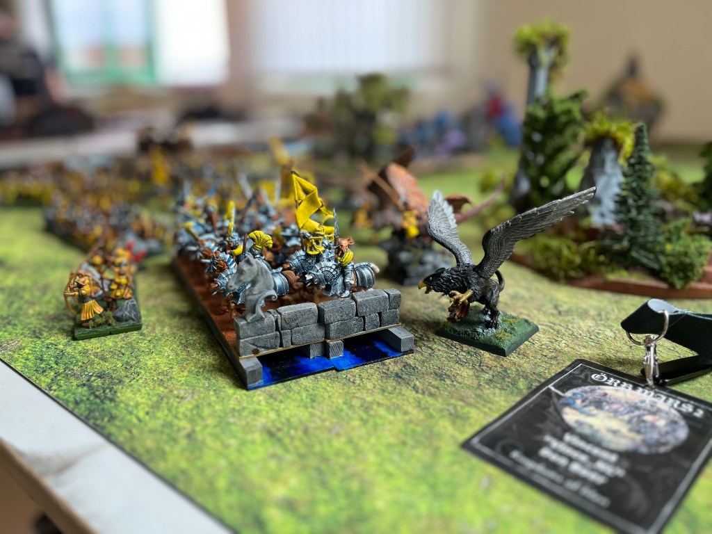 - a moderately powerful shooting contignent. Three balistas can do some damage (4+ to hit, blast d3 and piercing 2 average 1,3 damage vs def 5+ per balista. Their role is to destroy chaff (especially gargoyles, pegasi and similar stuff) first and foremost and after that to put pressure on heavy hitters. The horde of arquebussiers (I’m not gonna call them rifles, rifles were a 19-th century invention) is a big block of nerve that has to be dealt with. The wizard’s mind fog is a surprisingly useful addition to this force, either forcing a nerve check or adding shattering is far more useful that you’d think. the 75 points left over went into another troop of bowmen which was just a bit of unit strength that could add to the shooting barrage and take a wound or to before fleeing the field.