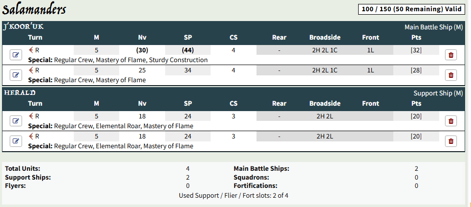 Currently, the fleet consists of two medium battle ships and two each of the small and medium support ship. The fleet easily reaches 150 points, which is more than enough for demo battles. (I usually do 100 points for starters)