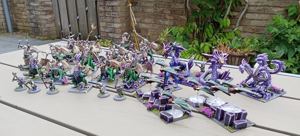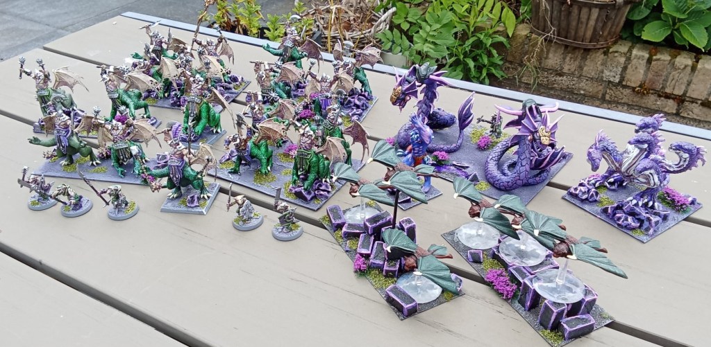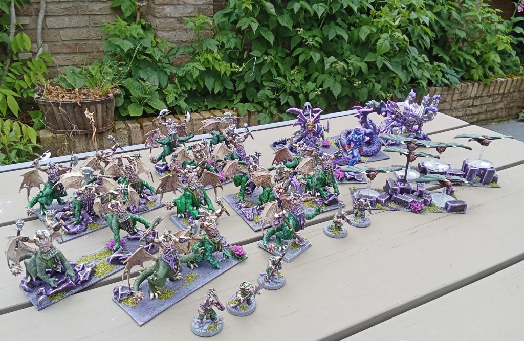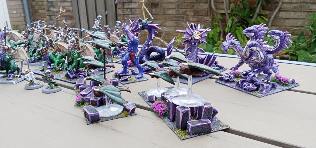 The models are mainly 3d prints (berserkers, hydra) as well as a pair of upscaled Mantic wyrm riders from the Vault as Nagarri. The warlock is a 3d printed ogre, I painted one time as a test model for my ogre army which happened to have the right colours. The gargoyles are my old GW giant bat models which have had their paint job and bases upgraded. Finally, the sacrificial imps are six Mantic Goblins painted in this army colour’s scheme.