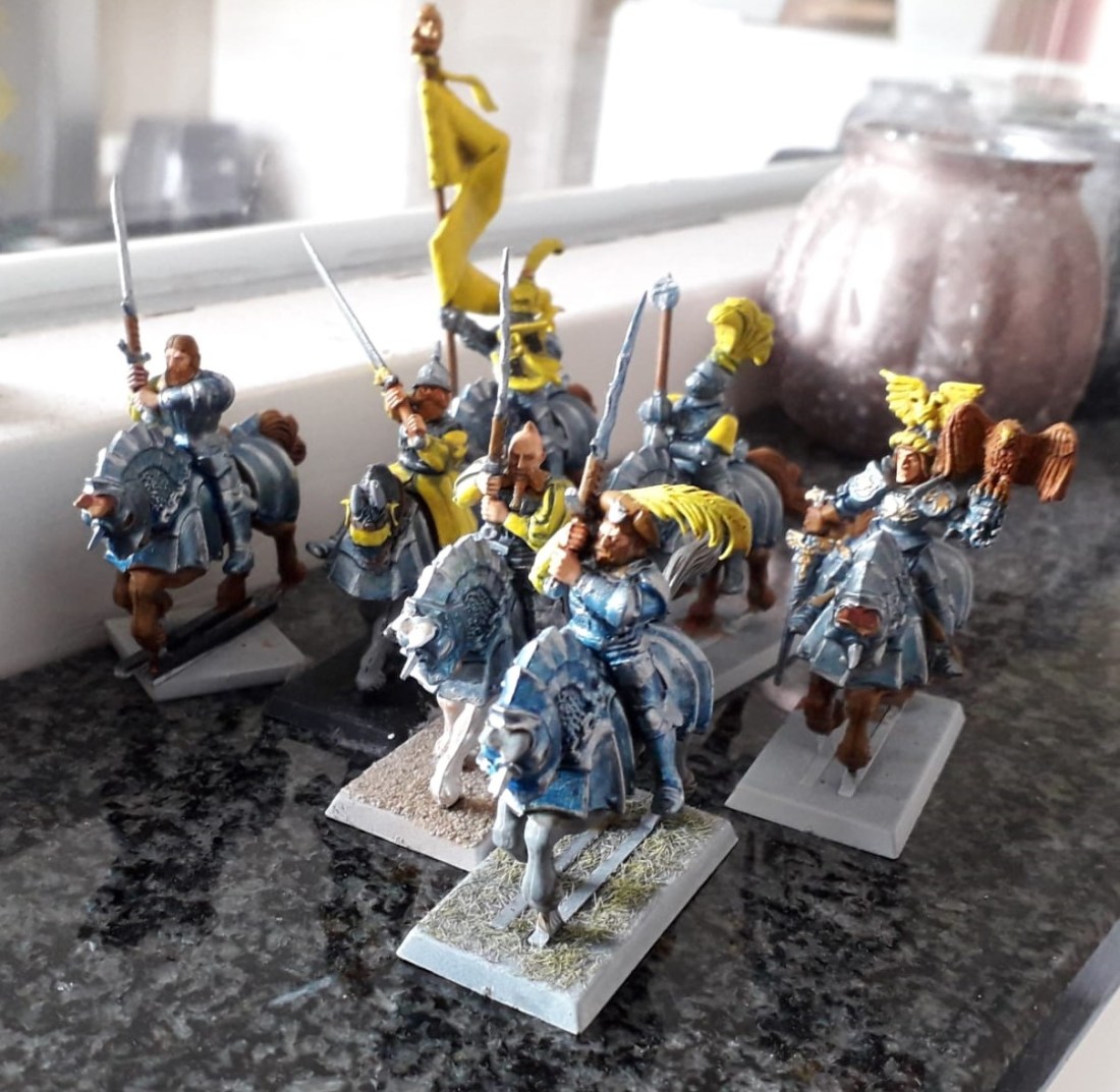 Almost a month ago, I posted my current projects - a regiment of knights. By now, these are finished: Other pictures at the end of this blog post. I really dig the yellow on steel-with blue ink, a distinctly different colour scheme which does tie in with my army by use of the yellow. As … Continue reading January hobby update – knights