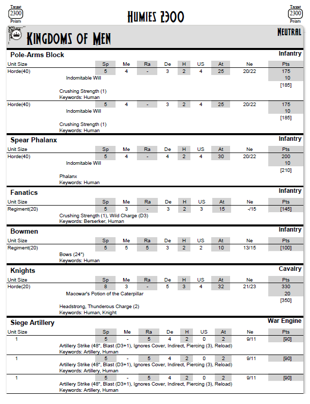 This is a blog post copied from my post on the Kings of War forum on the same subject. I'm going into the changes to Kingdoms of Men in the recent Clash of Kings book. Im going through the changes one by one. First of all, the removal of the pot shot rule to both crossbowmen and … Continue reading Kingdoms of Men in Clash ‘24